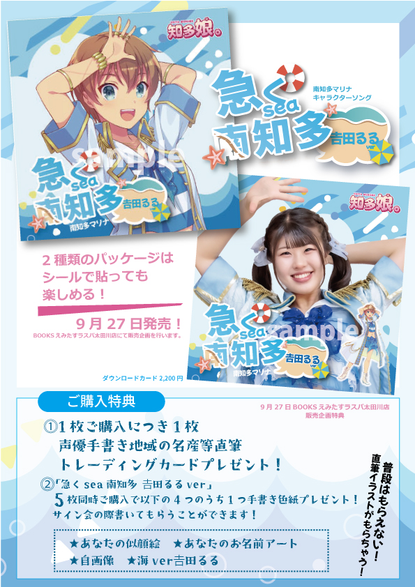 2025.09.26 NEWS 急くsea南知多 𠮷田るるver 2025年9月27日販売開始! 南知多マリナが歌う、南知多の特産や見どころが1曲に詰まったPOPな楽曲が 現南知多マリナ声優 𠮷田るるverとして販売します! 9月27日18:00よりBOOKSえみたすラスパ太田川店にて 販売企画も実施します。 前へ 最新情報一覧へ戻る 次へ EVENT イベント情報 CHARACTER キャラクター紹介 VOICE ACTRESS 声優紹介 GOODS グッズ購入
