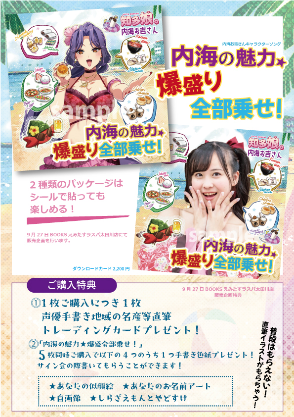 9月21日販売を予定していました、「急くsea南知多 𠮷田るるver」ダウンロードカードも同時発売!また、先日発売した「内海の魅力★爆盛全部乗せ!」ダウンロードカード同日販売企画も予定しています